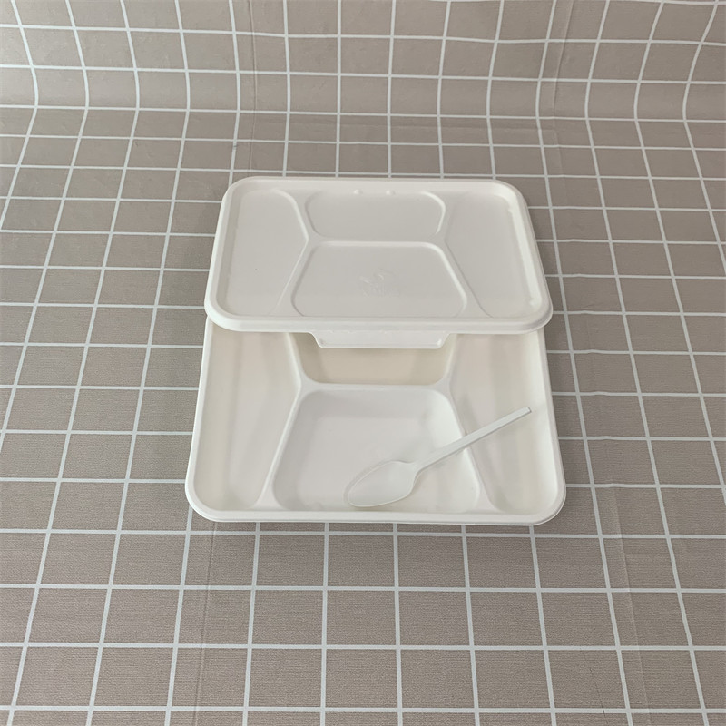 Baki kompartemen 5 ampas tebu dengan penutup memenuhi standar Eropa dan standar AS.