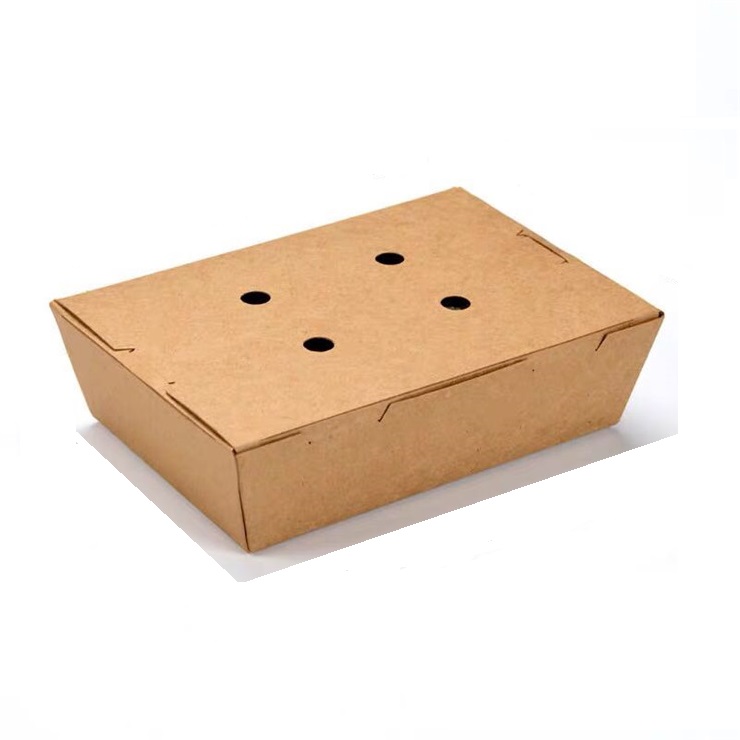 Kotak Makanan Kertas Kraft Berlubang oleh Shenglin Packaging terbuat dari karton kraft coklat bebas klorin, ramah lingkungan dan aman untuk makanan.