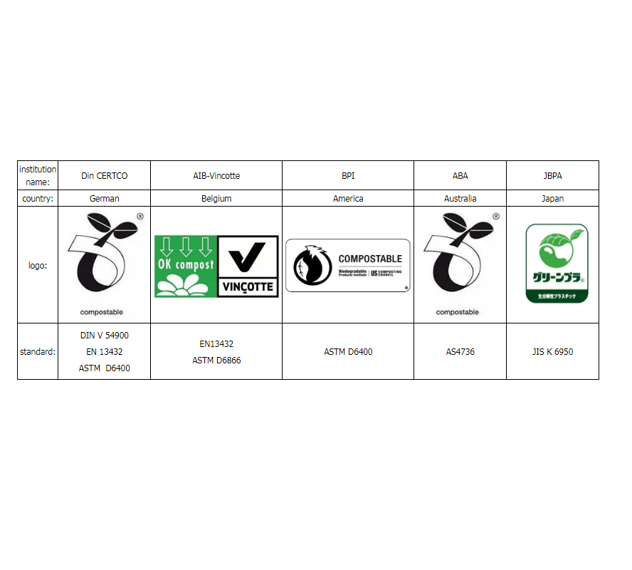 Saat ini, lembaga sertifikasi biodegradable utama di pasar adalah Din CERTCO, AIB Vincotte, BPI, ABA dan JBPA.